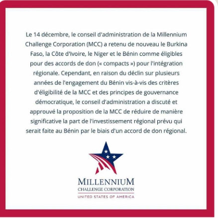 Conséquences, une sanction est infligée au Bénin. C'est ce qu'il convient de retenir du communiqué rendu public par Millénium Challenge Corporation (MCC). Éligible pour des accords de don "compacts" pour l'intégration régionale, le Bénin s'est vu sa part « réduire de manière significative ». Depuis un moment, le pays de Joe Biden ne cesse de tirer la sonnette d'alarme pour déplorer la mal gouvernance sous Talon.